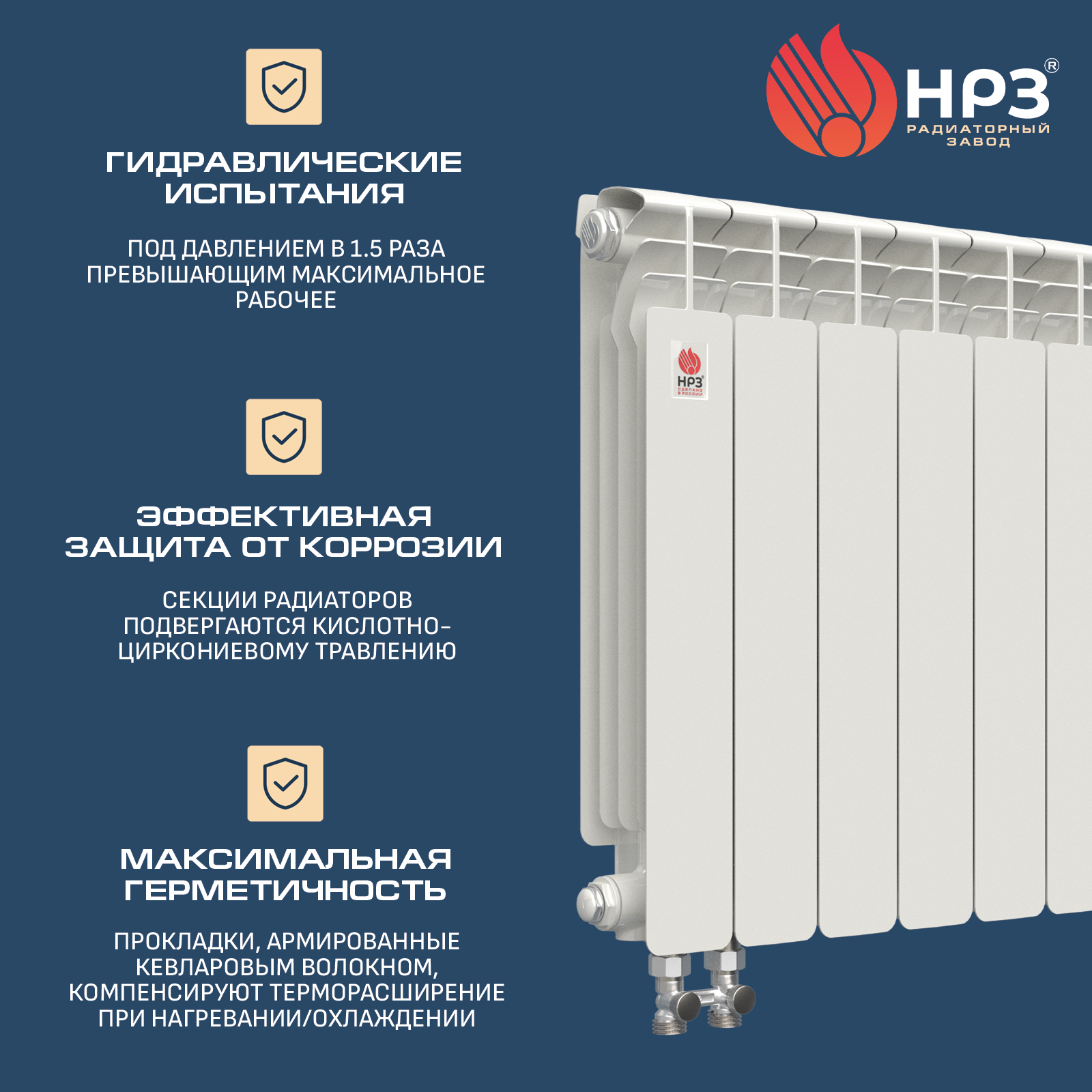 Алюминиевые радиаторы НРЗ изготовлены с учётом особенностей российского климата. При сниженном потреблении тепловой энергии (теплоносителя) обеспечивают быстрый прогрев воздуха внутри жилых, общественных и производственных зданий, расположенных даже в северных широтах страны. Малая инерционность алюминиевых радиаторов НРЗ обеспечивает эффективное терморегулирование для обеспечения максимального уровня комфорта пользователя. Наши радиаторы выполнены из высокопрочного алюминиевого сплава АК12М2 методом литья под давлением. Каждая секция отливается целиком, затем к ней приваривается донышко-отстойник. Компактные, лёгкие, не требующие окраски отопительные приборы НРЗ устойчивы к образованию коррозии. Радиаторы поставляются по 2–14 секций, которые соединены ниппелями и каучуковыми прокладками Kevlar®️, с двойным графитовым покрытием. Каждая отдельная секция и радиатор в сборе проходят опрессовку и гидравлическое испытание.